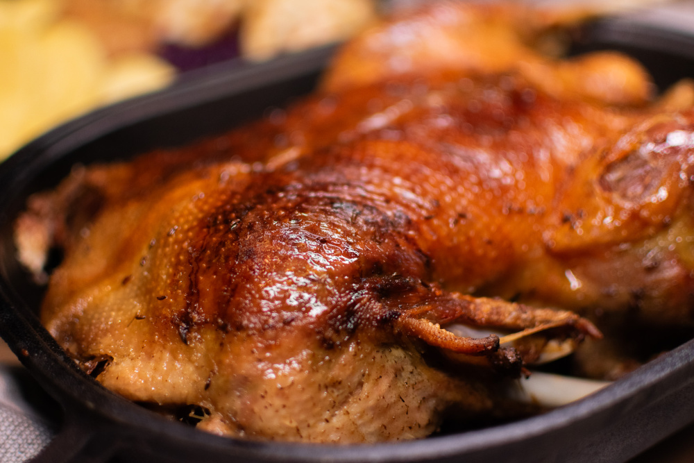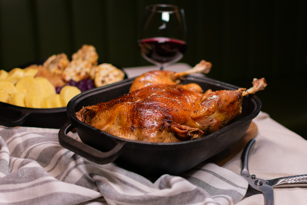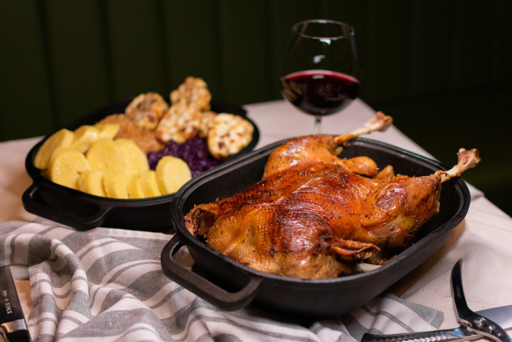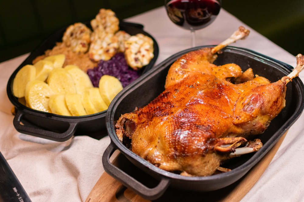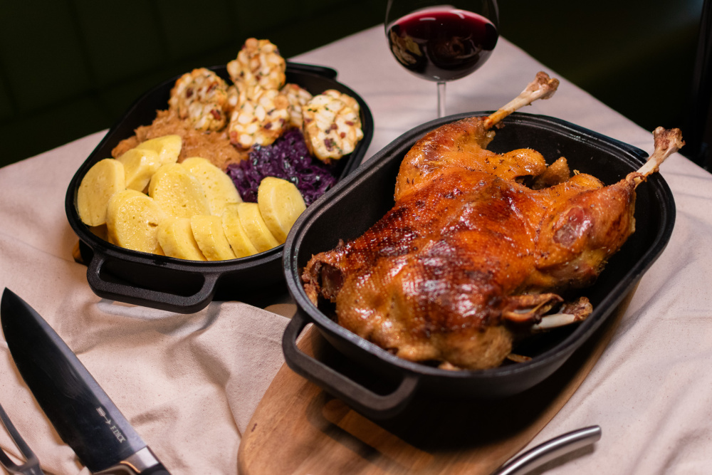 Hlavní chod samozřejmě patří svatomartinské huse v celé její parádě. Můžete si dopřát čtvrtku nebo rovnou celou husu v pekáči pro celou partu nebo rodinu, podávanou s dušeným červeným zelím a bílým zelím s kmínem, bramborovými lokšemi potřenými husím sádlem a domácím houskovým knedlíkem. A protože dobrý konec je sladký konec, máme pro vás úžasný makový cheesecake se švestkovým rozvarem a špetkou perníkového koření.